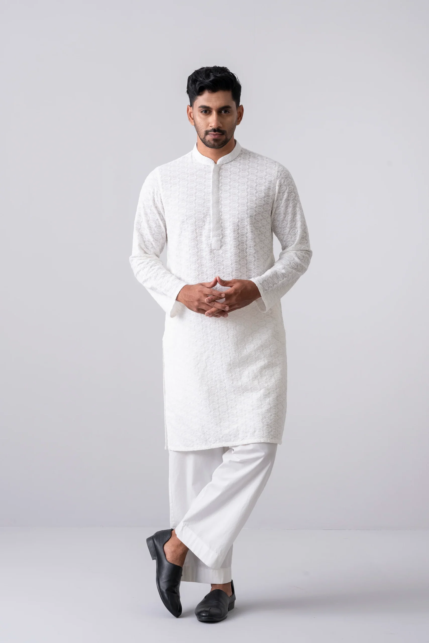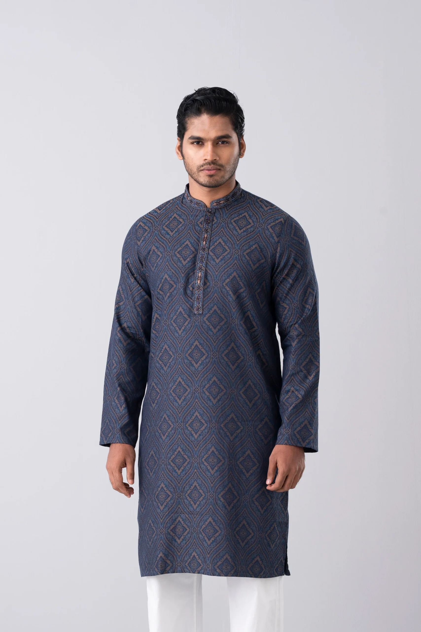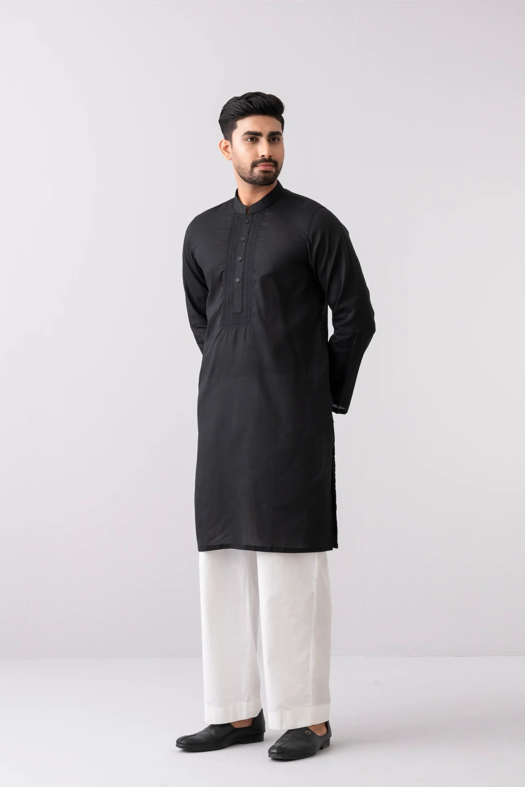 A regular fit Panjabi crafted from 100% cotton breathable fabric, featuring premium embroidery detailing on around placket with DTM buttons, offers a stylish yet comfortable semi-formal look. Perfect for effortless elegance and all-day ease.